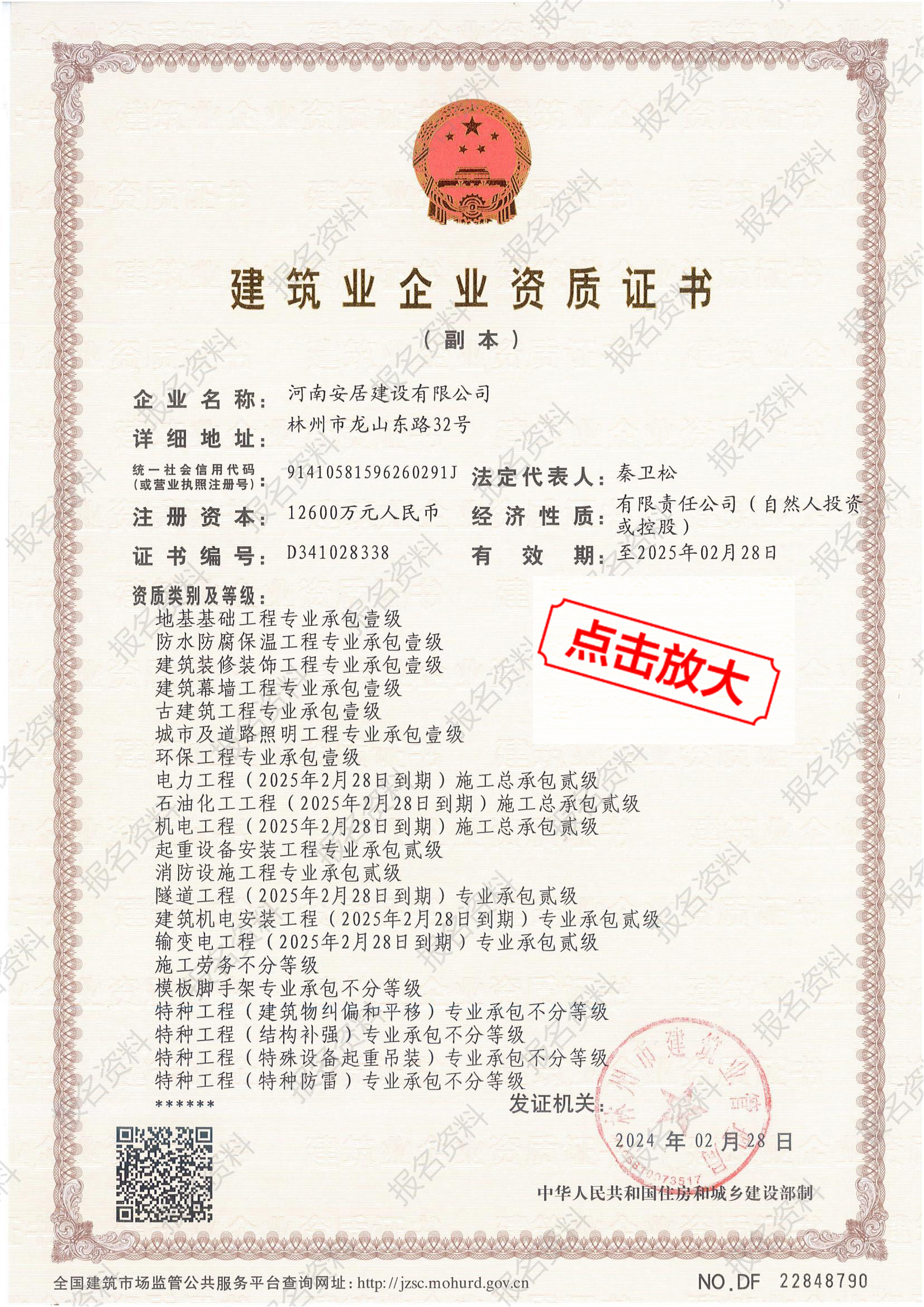 滔滔黃河哺育了中華民族拼搏向上的奮斗精神,巍巍太行造就了中原兒女的紅旗渠精神。百萬(wàn)林州人下太行,鑄就了中國(guó)建筑之鄉(xiāng)響當(dāng)當(dāng)?shù)囊燮放啤:幽习簿咏ㄔO(shè)有限公司從誕生起血液里就流淌著紅色基因,秉承“安得廣夏千萬(wàn)間,大庇天下寒士俱歡顏”的擔(dān)當(dāng)精神,用鋼筋混凝土筑起了高樓大廈,也用一流品質(zhì)、家國(guó)情懷打造了安居建設(shè)的輝煌成績(jī)。公司成立于2012年,注冊(cè)資金12600萬(wàn)元,公司成立至今,擁有建筑,市政施工總承包等十項(xiàng)一級(jí)資質(zhì);其他二級(jí)等資質(zhì)共二十余項(xiàng)。公司秉承質(zhì)量第一,服務(wù)為主,堅(jiān)持垂直管理,從不設(shè)立分公司等分支機(jī)構(gòu)。
